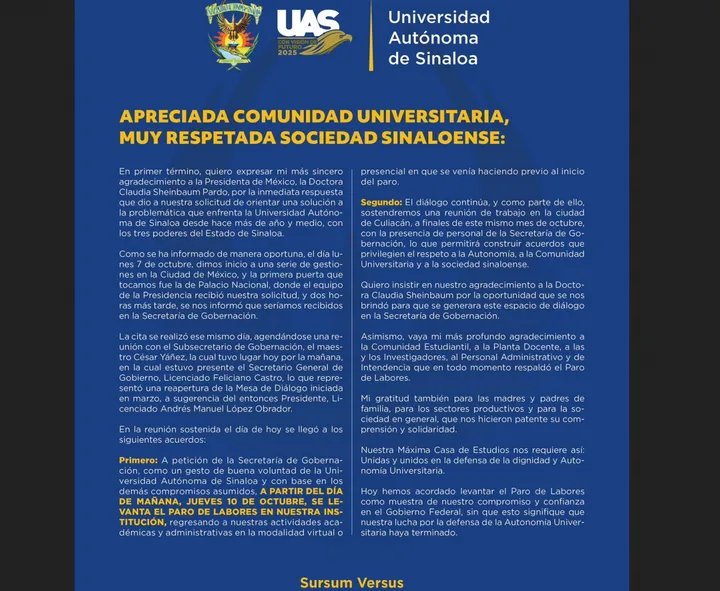 Levanta la UAS el paro de labores, agradeciendo la apertura del diálogo gracias a la Presidenta Claudia Sheinbaum y la SEGOB; se reinician actividades este jueves