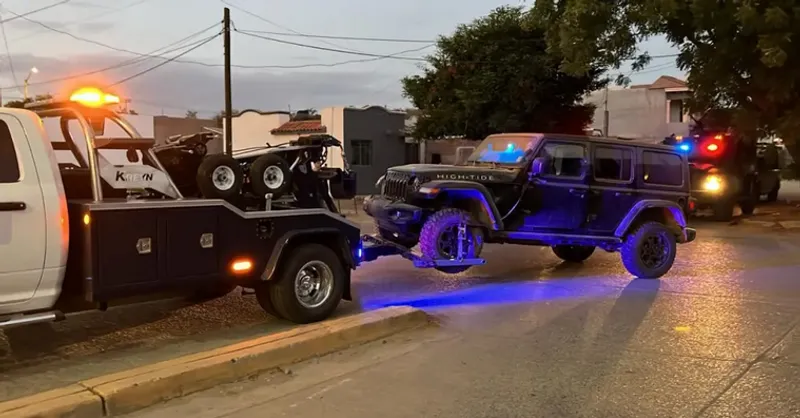 Durante el operativo, se observó a los elementos trasladar, con apoyo de una grúa de la Policía de Investigación, un Jeep Rubicón negro, así como otros automóviles de lujo de modelo reciente, también de color negro.
